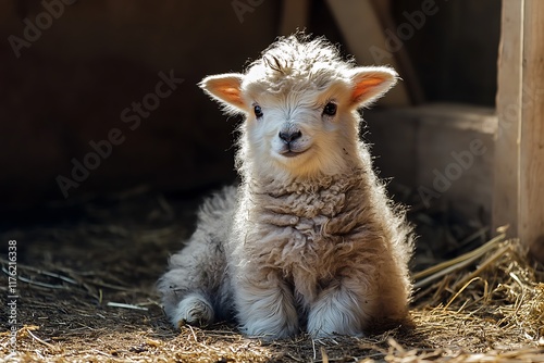 Fototapeta premium Fluffy white lamb resting peacefully in a sunlit barn, enjoying a quiet...