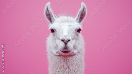 Fototapeta premium Fluffy White Llama Portrait Against Pink Background