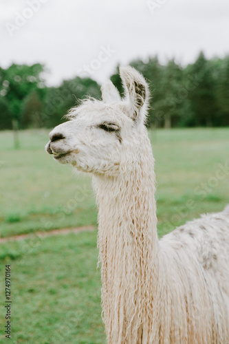 © tisaeff, Obraz premium Fluffy white llama stands gracefully in a lush green field during a cloudy afternoon