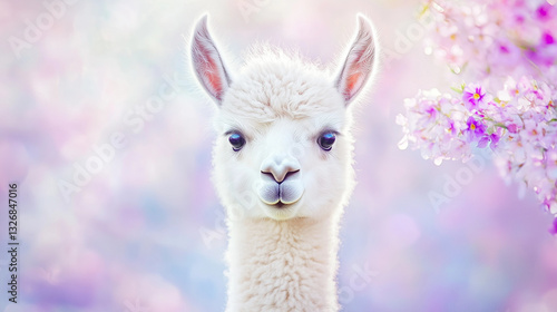© Andrey, Fototapeta premium Fluffy white llama with a serene expression, framed by soft pink flowers and greenery, ideal for animal and spring themes.