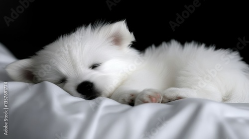 © SATRIANANGISAN, Fototapeta premium Fluffy white puppy sleeping peacefully on a pillow