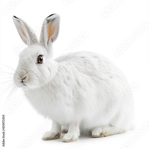 Fototapeta premium Fluffy white rabbit sitting calmly on a white background, displaying its...