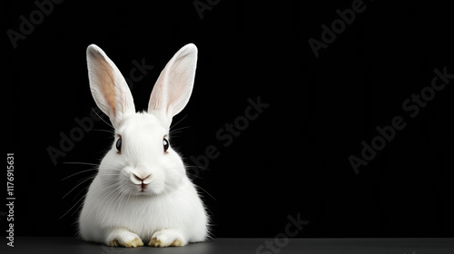 Obraz premium fluffy white rabbit with long ears sits against black background