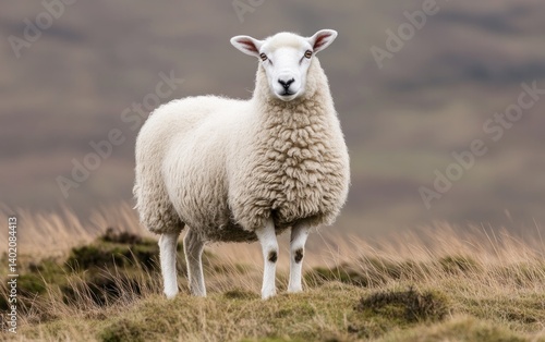 © creatfive, Fototapeta premium Fluffy White Sheep in Brown Grass Field