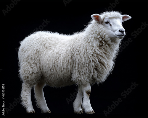 © ROni051, Fototapeta premium Fluffy White Sheep on Black Background – Soft Wool, Gentle Expression, High-Resolution Photo