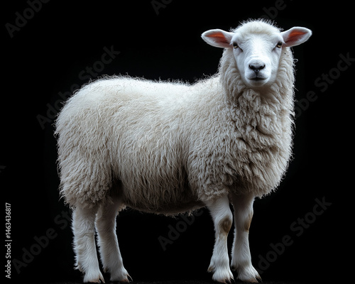 © ROni051, Fototapeta premium Fluffy White Sheep on Black Background – Soft Wool, Gentle Expression, High-Resolution Photo