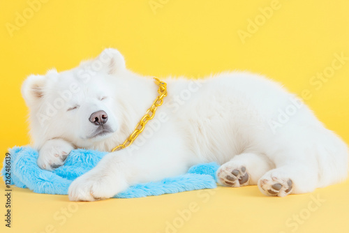 © RYUJIN Studio, Fototapeta premium Fluffy white teddy bear sleeping in a cozy position, hugging a small blue blanket, ultra-detailed plush texture, soft fur detail, isolated on pastel yellow background