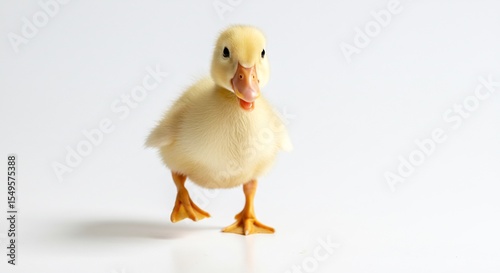 Fototapeta premium Fluffy yellow duckling strides forward against bright white background. AI...
