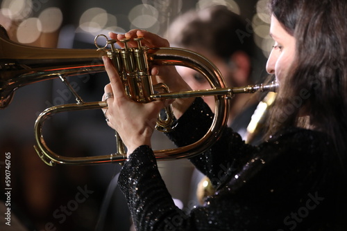 © Nina, Obraz premium Flugelhorn in the hand of a musician playing a close-up view of a golden musical instrument