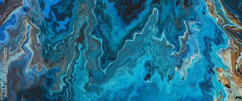 © Daniil, Naklejka premium Fluid art background in blue tints with gilding. Flowing wave effect of liquid ink. Aquamarine azure turquoise cyan mix with gold dust. Abstract texture of acrylic paints on canvas. Surreal wallpaper.