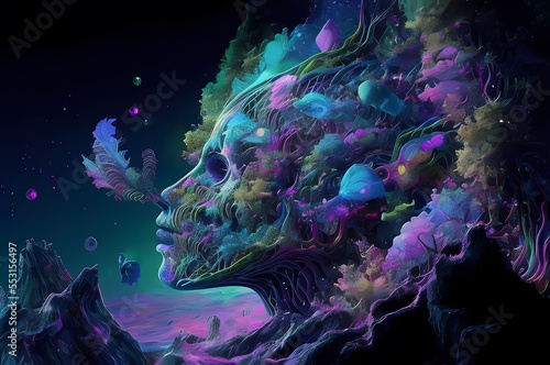Naklejka premium Fluorescent Dreamy Mystical colorful glowing fantasy world Imagination of...