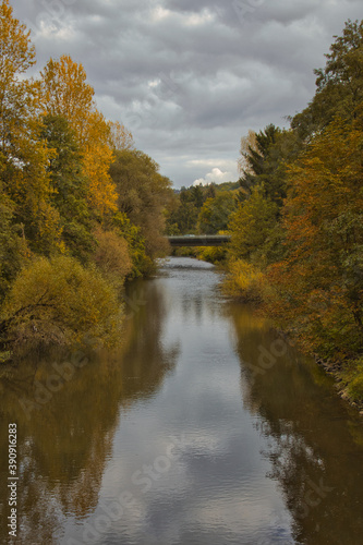 © Lars, Fototapeta premium Fluss mit Brücke im Hintergrund umrahmt von herbstlichen Bäumen