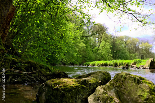 Fototapeta premium Flussbiegung im Wald mit großen Felsen im Sommer