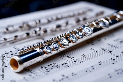Naklejka premium Flute lying on a sheet of music, its silver body gleaming under the light,...