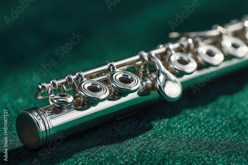 Fototapeta premium Flute resting on green fabric during a musical practice session in a well-lit room