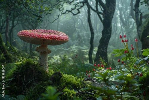 © nsit0108, Naklejka premium Fly agaric mushroom growing on mossy ground in magical foggy forest with small red flowers