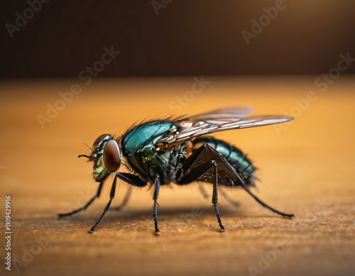 © Sergei, Obraz premium .Fly insect sits on the table, close-up view.