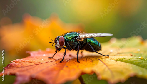 © hardvicore, Naklejka premium Fly resting on green-orange leaf, insect with wings, blurred natural autumn backdrop. Macro shot.