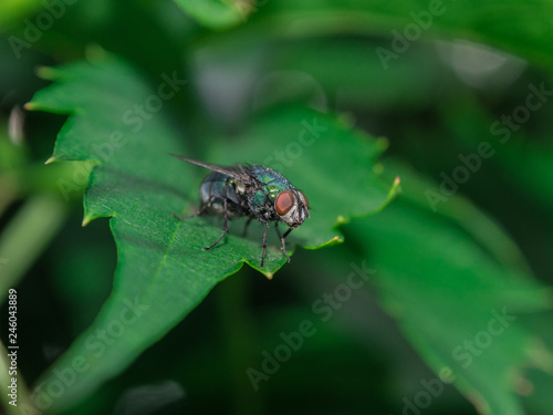 © Michał Kiełbicki, Naklejka premium Fly sitting on a green leaf.