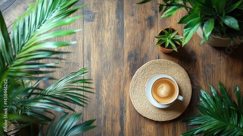 © nanskyblack, Fototapeta premium Flyer mockup on cafe table surrounded by plants and a coffee cup
