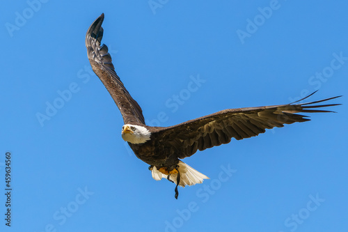 Obraz premium Flying bald eagle on the blue sky