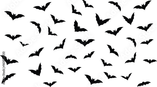 © Hasib World, Fototapeta premium Flying bats silhouette pattern, scattered bat vector, spooky wildlife clipart, black bat swarm, Halloween graphic design, chaotic bat motion