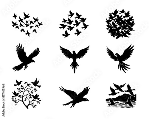 © MorshedBD, Obraz premium Flying Bird Silhouette Vector Set Isolated on White