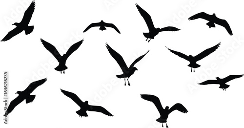 © Morsalin Creatives, Naklejka premium Flying Bird Silhouettes in Various Poses, Black Vector Illustration for Nature, Wildlife, and Graphic Design