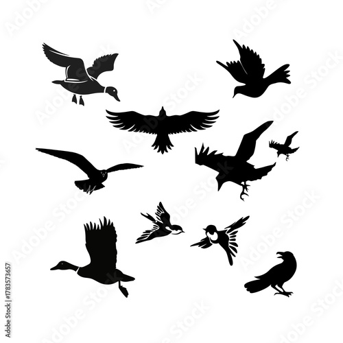 Obraz premium Flying birds include: eagle, sparrow, pigeon, parrot, crow, owl, dove,...