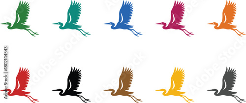 © jakircreativedesign, Obraz premium Flying crane silhouettes in various colors, Colorful crane bird icons for design