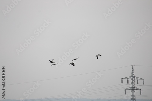 © Christian Kaiser, Obraz premium flying cranes on a gray sky