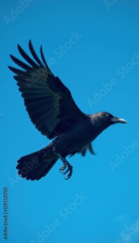 © OneWayPhoto, Obraz premium Flying crow against a stark blue background, bird in flight, nature scene, blue sky