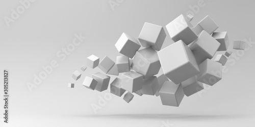 © 3dddcharacter, Obraz premium Flying cubes on a white background. 3d render.