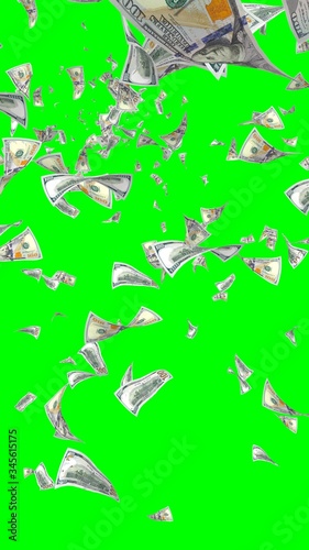 Naklejka premium Flying dollars banknotes isolated on chromakey. Money is flying in the air. 100 US banknotes new sample. Vertical orientation. 3D illustration
