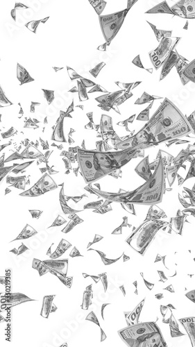 © Plastic man, Naklejka premium Flying dollars banknotes isolated on white background. Money is flying in the air. 100 US banknotes new sample. Black and white style. 3D illustration