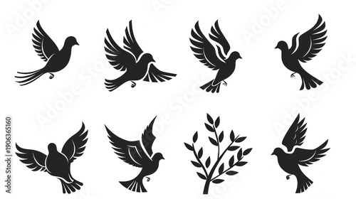 © Al fikk, Obraz premium Flying dove silhouettes set against white background vector design elements
