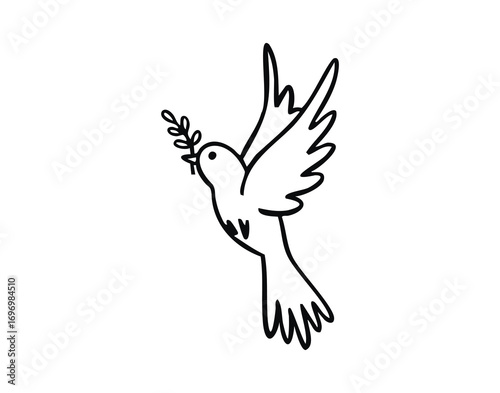 © Yanka, Naklejka premium Flying dove with branch line art outline, monochrome hand drawn.