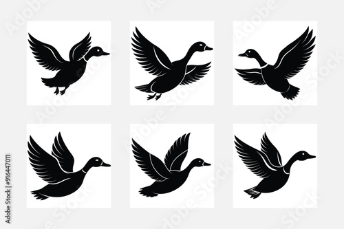 © Selinaakther, Obraz premium Flying duck silhouette vector illustration.