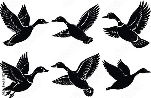 Obraz premium Flying Duck Silhouettes set, Duck silhouette vector icon