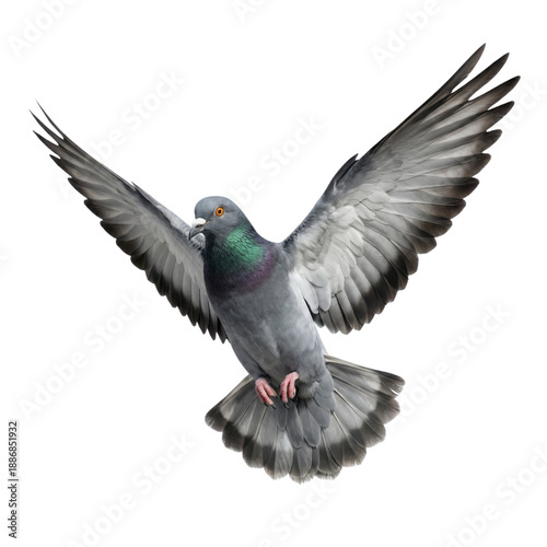 © ArsiStudio, Naklejka premium Flying Feral Pigeon with Wings Spread on White Background