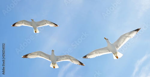 © vencav, Obraz premium Flying flock of seagull with blue sky in the background.