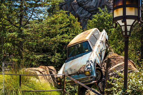 © Olga, Naklejka premium Flying Ford Anglia in Universal Studio Park. The Wizarding World of Harry Potter