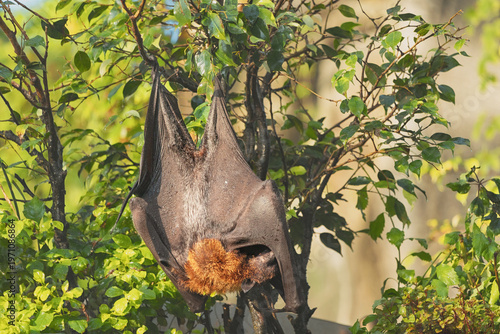 © EdNurg, Obraz premium Flying fox sleeping while hanging upside down from a tree branch