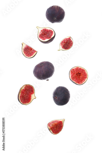 © Pixel-Shot, Fototapeta premium Flying fresh ripe figs on white background
