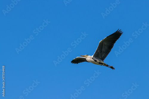 © Roel, Fototapeta premium Flying grey heron against a deep blue sky