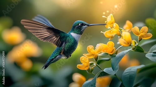 © BAYC, Fototapeta premium Flying hummingbird in a blooming garden