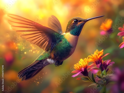 Fototapeta premium Flying hummingbird in a blooming garden