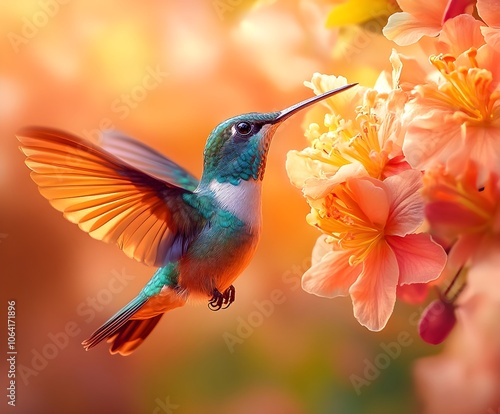 © BAYC, Fototapeta premium Flying hummingbird in a blooming garden