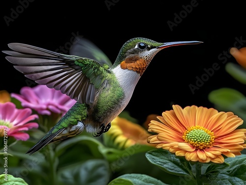 Fototapeta premium Flying hummingbird in a blooming garden