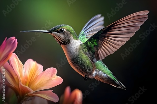 © BAYC, Fototapeta premium Flying hummingbird in a blooming garden